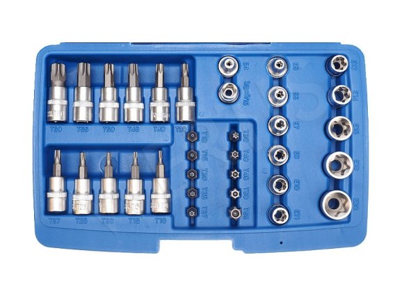 Komplet specjalistycznych nasadek torx, stosowanych w motoryzacji, mechanice oraz elektronice. Nasadki służą do odkręcania śrub i nakrętek w urządzeniach, do których producent utrudnił dostęp zwykłymi kluczami. Nasadki wykonane są ze stali chromowo vanadowej, która gwarantuje ich wytrzymałość i długą żywotność.
