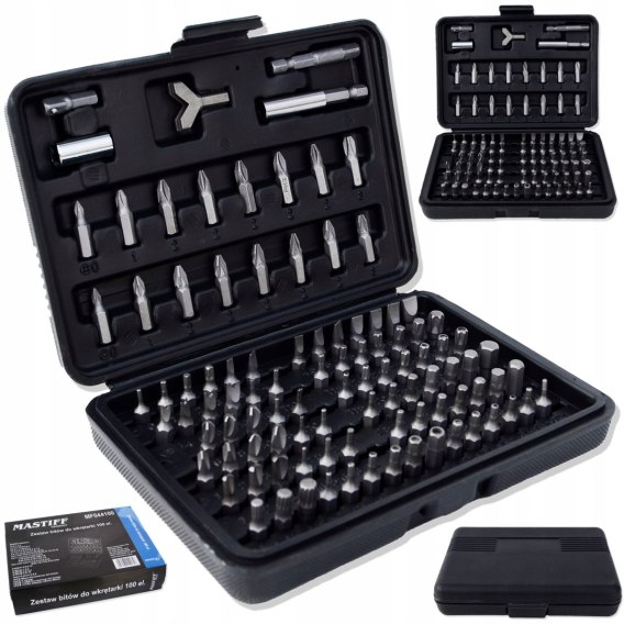 100-elementowy zestaw bitów wykonanych ze wzmocnionej stali węglowej. Do stosowania z narzędziami elektrycznymi. Całość zapakowana w praktyczną walizkę.