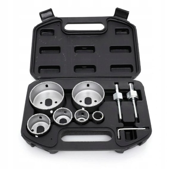Zestaw KD10285 zawiera 6 otwornic o rozmiarach: 22, 29, 38, 44, 67, 73mm, klucz imbusowy i dwa adaptery z wiertłem.