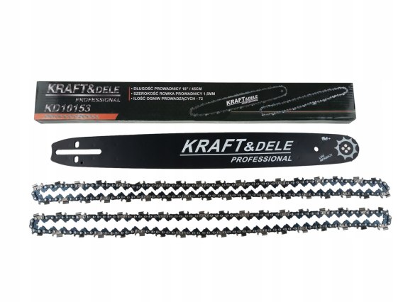 Zestaw składający się z prowadnicy oraz dwóch łańcuchów. Wykonany z najwyższej jakości materiałów. Prowadnica przystosowana jest do pilarek wielu marek, między innymi Stihl, Husqvarna, Alpina, Kraft&Dele oraz wielu innych pracujących z łańcuchami 3/8 i szerokością ogniwa prowadzącego 1,5mm.
