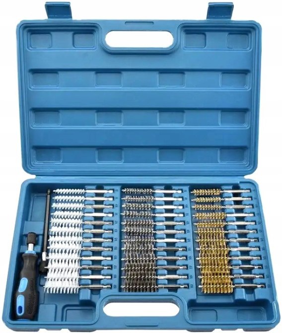 Zestaw szczotek do gniazd wtryskiwaczy, gniazd świec iskrowych i żarowych. W komplecie jest przedłużka i uchwyt. 38 szczotek do czyszczenia o różnej twardości. Szczotki nadają się również do użytku w wiertarkach elektrycznych i pneumatycznych. Wszystkie szczotki z napędem 1/4". Do czyszczenia i gratowania cylindrów, tulei, rur, gniazd świec, wtryskiwaczy itp.