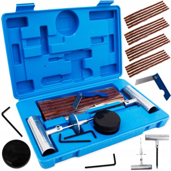 Zestaw do naprawy opon samochodowych. Komplet jest prosty w obsłudze i uniwersalny. Umożliwia naprawę opony w kilka minut.