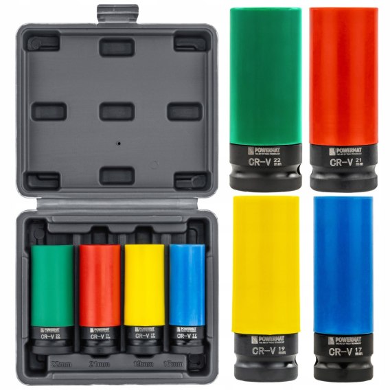 Zestaw 4 nasadek udarowych Powermat (17, 19, 21, 22 mm) wykonanych ze stali chromowo-wanadowej zapewnia bezpieczne odkręcanie śrub w felgach aluminiowych. Miękkie tuleje chronią lakier, cienkie ścianki umożliwiają pracę w ciasnych gniazdach, a kolorowe oznaczenia i praktyczna kasetka gwarantują wygodę i szybki wybór rozmiaru.