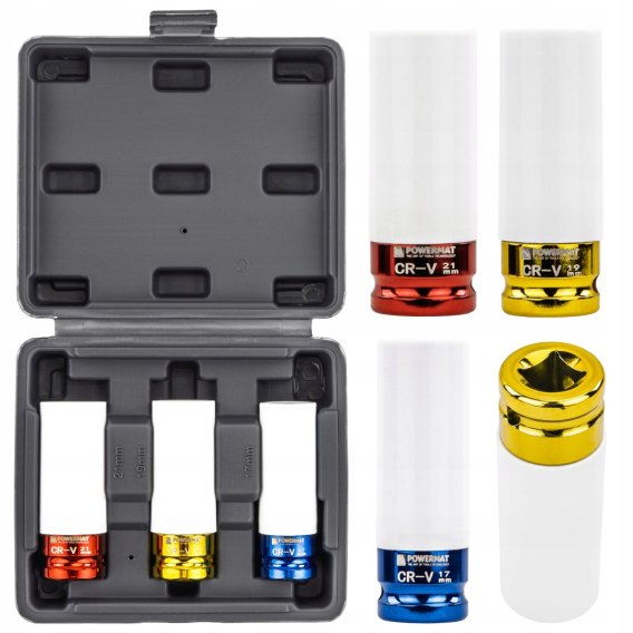 Zestaw obejmuje 3 nasadki w rozmiarach 17 mm, 19 mm i 21 mm, dzięki czemu pasuje do najczęściej spotykanych śrub w felgach aluminiowych.