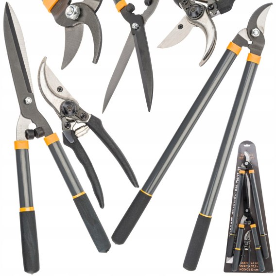 Komplet zawiera sekator nożycowy do kwiatów, nożyce do żywopłotu oraz nożyce do gałęzi, co czyni go wszechstronnym narzędziem ogrodowym.
