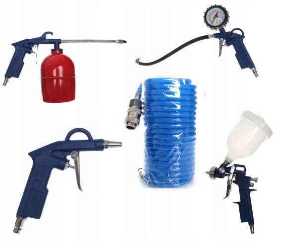 Wszystkie elementy zestawu cechuje wysoka, perfekcyjna jakość wykonania. Pistolet do malowania lakierowania z górnym zbiornikiem jest idealny do precyzyjnego malowania metalikami, lakierami, farbami akrylowymi oraz wodorozcieńczalnymi. Rewelacyjnie sprawdza się w lakiernictwie samochodowym. Pistolet do przemywania tzw."ropownica" ma długą, praktyczną dyszę rozpylającą, która ułatwia mycie i czyszczenie Pistolet do pompowania z manometrem jest doskonały do pompowania i kontroli ciśnienia ogumienia pneumatycznego. Posiada gumową obudowę zegara. Wyposażony jest w zawór spustowy powietrza. 5m wąż spiralny do podłączania narzędzi pneumatycznych, pistoletów natryskowych, innych urządzeń pneumatycznych lub do przedłużania węży pneumatycznych. Pistolet do przedmuchiwania będzie pomocny przy usuwaniu zanieczyszczeń ze słabo dostępnych miejsc. W skład zestawu wchodzą 3 końcówki, które są pomocne m. in. w pompowaniu piłek, pontonów, kół samochodowych, zabawek, materaców.