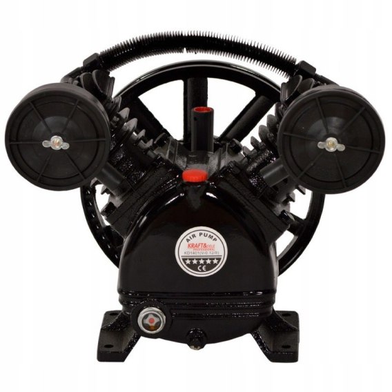 Sprężarka powietrza dwutłokowa V-0.25/8 Polskiej marki Kraft&Dele smarowana olejem, wyposażona w koło pasowe, które jednocześnie chłodzi kompresor oraz boczną chłodnicę powietrza. Cylindry wykonane z żeliwa.