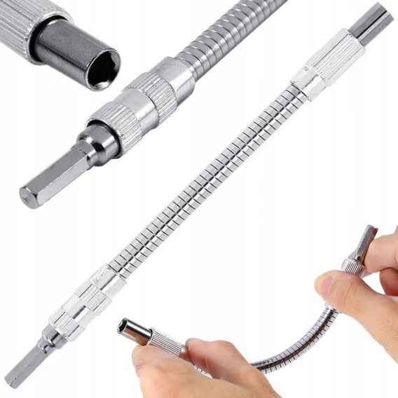 Przedłużka przyda się, gdy będziesz chciał przewiercić śrubę w trudno dostępnym miejscu dla wiertarki. Przedłużka jest elastyczna dzięki czemu możesz wygiąć ją w taki sposób, aby umieścić końcówkę w odpowiednim miejscu. Końcówka przedłużacza zaczyna się kręcic i pobudza do ruchu sprężyny co pozwala skręcić śrubę. Produkt jest wykonany z materiałów najwyższej jakości, dlatego jest solidny i trwały.